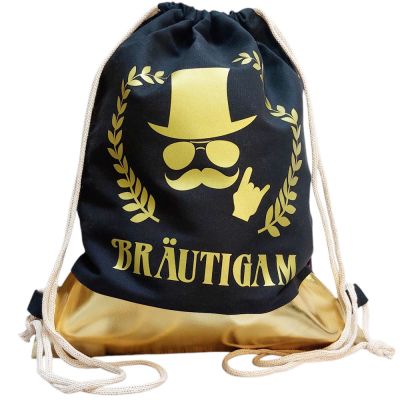 Hochwertig verarbeiteter JGA Bräutigam-Rucksack mit goldfarbenem Aufdruck und goldfarbener PU-Borte.