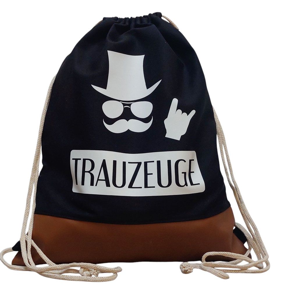 • Farbe des Turnbeutels: Schwarz mit brauner PU-Borte und weißem Trauzeugen-Motiv.