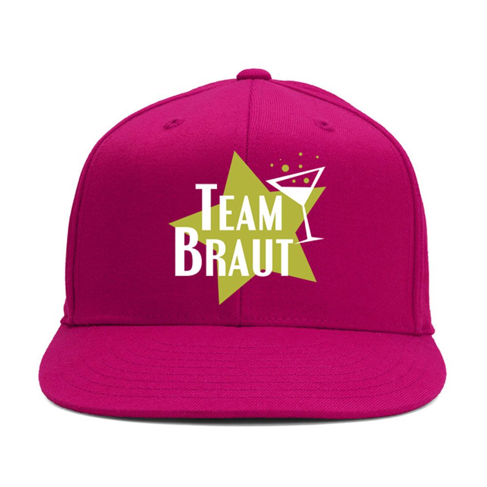 Auf der Vorderseite ist die Kappe mit einem großen, goldfarbenen Stern und der Aufschrift "Team Braut" in der Farbe Weiß bedruckt.