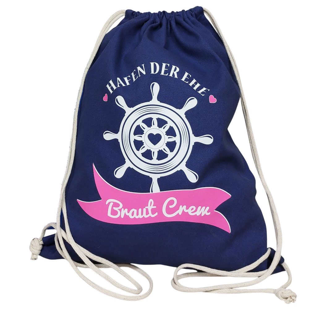 • Bedruckt ist der JGA-Beutel mit der Aufschrift "Hafen der Ehe - Braut Crew" im Marine-Design.