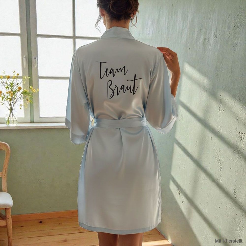 Bedruckt ist der JGA-Kimono auf dem Rücken mit dem schwarzen Schriftzug "Team Braut".